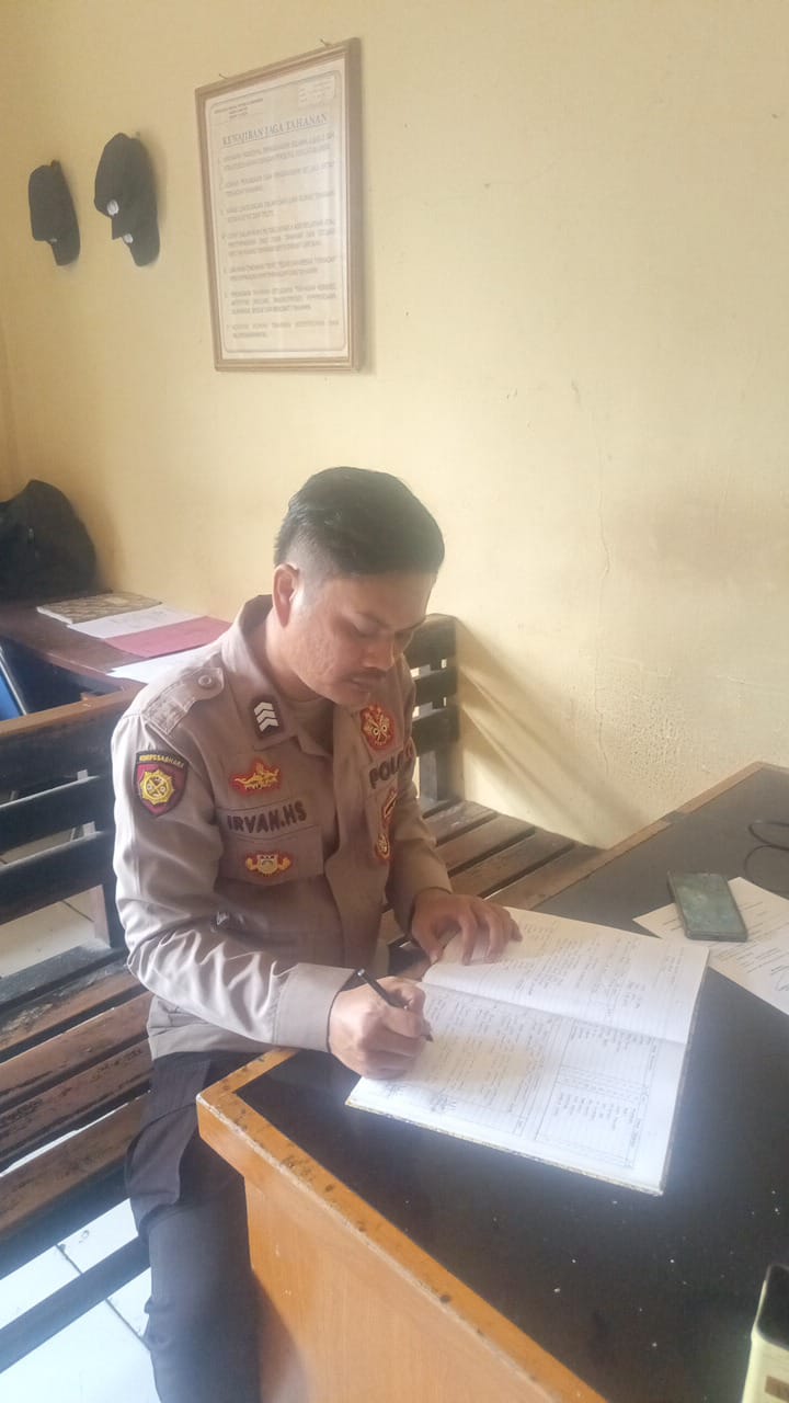 Cilegon, Polres Cilegon Polda Banten. BRIGPOL  Irvan anggota Sat Tahti Polres Cilegon Menulis kegiatan di buku mutasi dan kegiatan control tahanan.