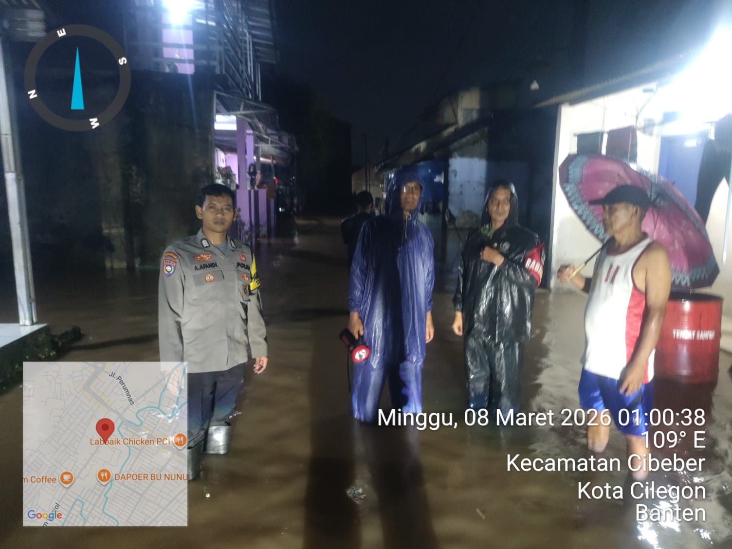 Polsek Cibeber Polres Cilegon berserta Camat Cibeber dan warga melakukan pengecekan situasi genangan air di Daerah Hukum Polsek Cibeber. Minggu, 8/03/2026
