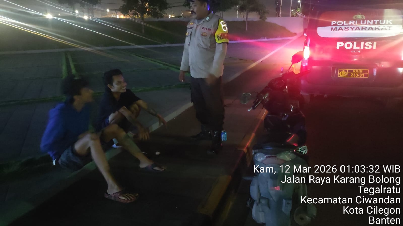 Cilegon - Personil Polsek Ciwandan Polres Cilegon Polda Banten Dalam Pelaksanaan Kegiatan Patroli dengan menyalakan lampu rotator berwarna biru di Daerah Hukum Polsek Ciwandan Polres Cilegon Polda Banten dari malam hingga dini hari, dalam rangka menciptakan situasi aman dan kondusif, Kamis (12/03/2026).