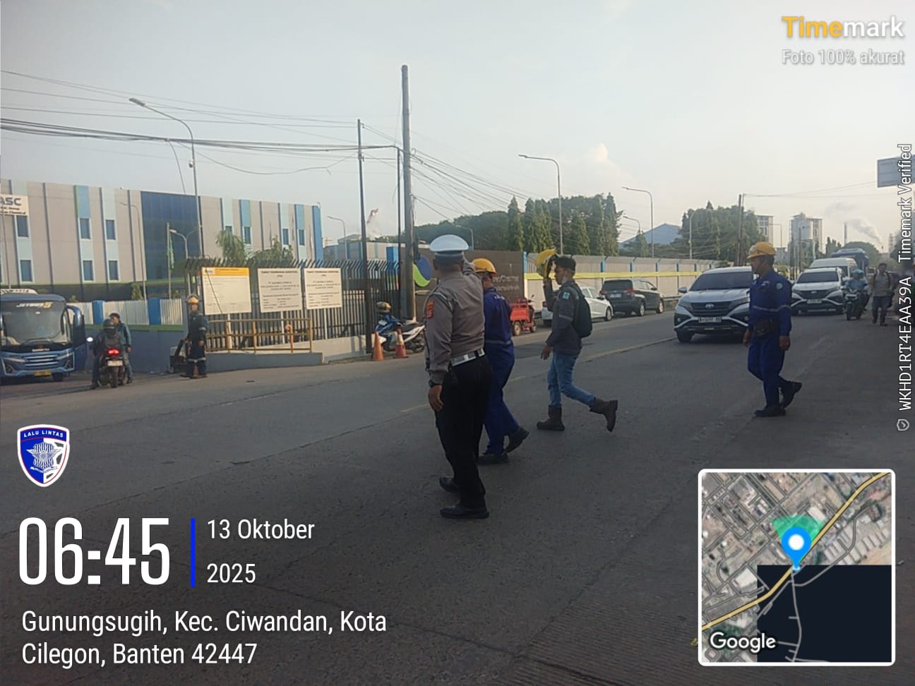 Cilegon - Personil  Polsek Ciwandan Polres Cilegon Polda Banten melaksanakan giat Strong Poin Pengaturan Lalu Lintas Disimpang Brown Kelurahan Gunung Sugih guna menciptakan ketertiban, keamanan dan Kelancaran Lalu-lintas bagi masyarakat, Senin (13/10/2025).