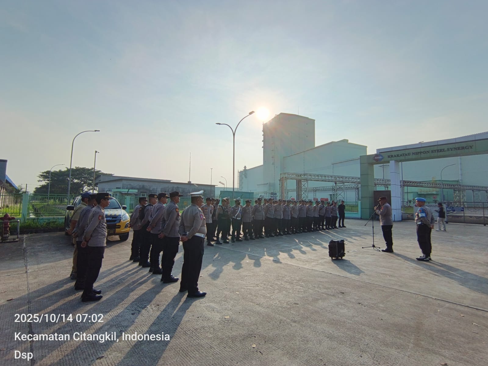Cilegon -  Kapolsek Ciwandan KOMPOL Andi Suherman Pimpin Apel pengamanan aksi damai dari Serikat Pekerja FSPMI Kota Cilegon ke PT. KNSS Cilegon pada Selasa, (14/10/2025).