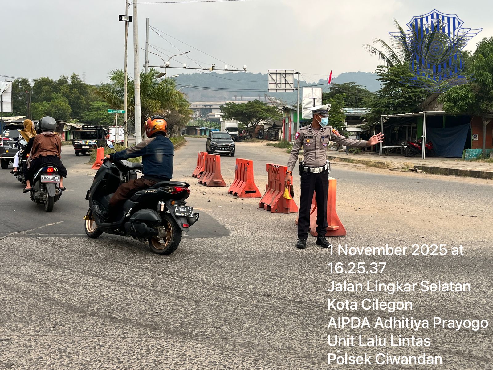 Personil Polsek Ciwandan melakukan pengaturan lalu lintas di depan Pos Lantas JLS Ciwandan dan peneguran terhadap pelanggaran kasat mata. Kegiatan ini dilaksanakan untuk memastikan keamanan dan kelancaran arus lalu lintas di wilayah hukum Polsek Ciwandan.