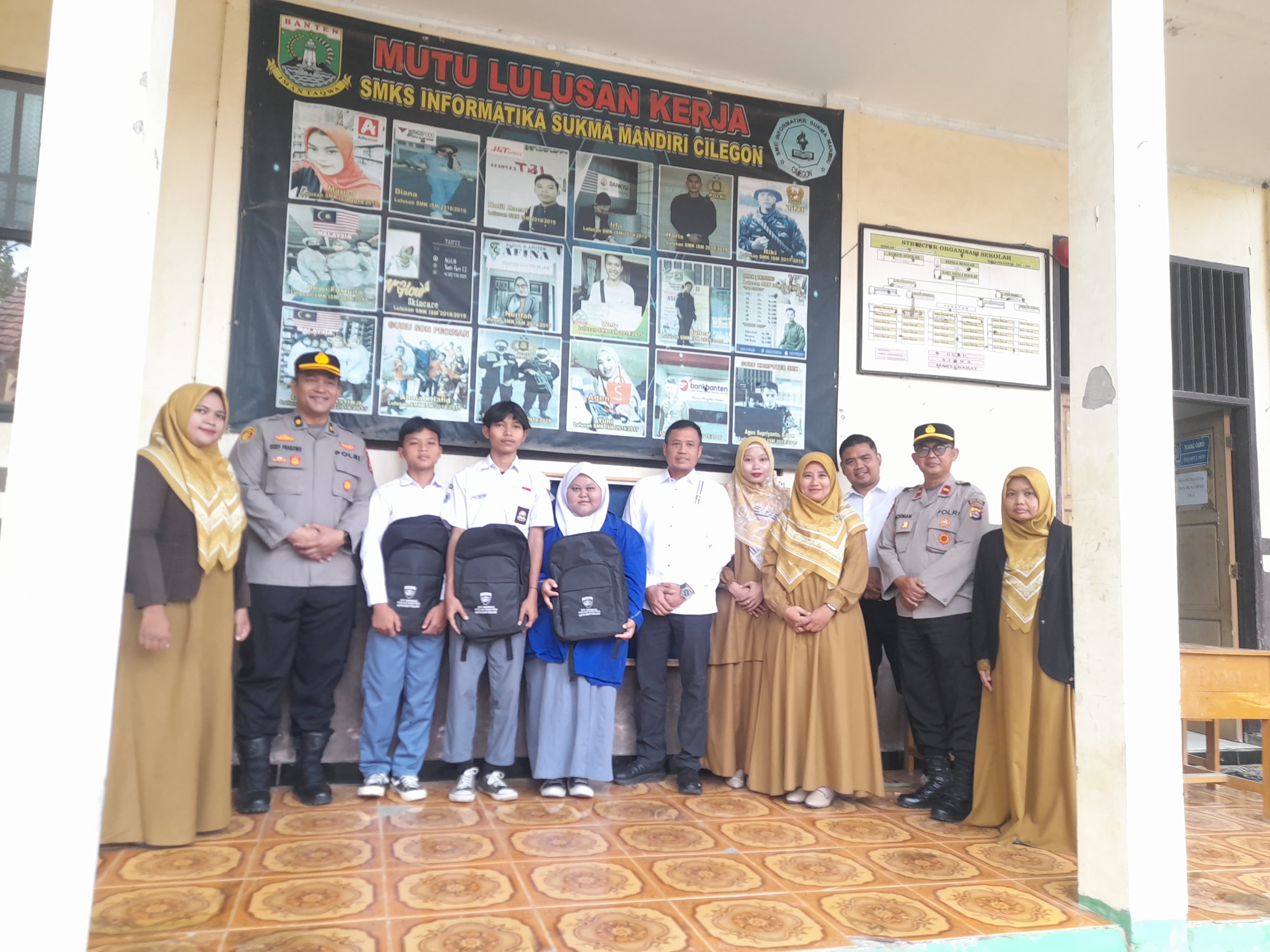 Dalam kunjungan tersebut, AKBP suyono memberikan bantuan tas secara simbolis kepada siswa-siswi SMK Informatika Sukma Mandiri Cilegon. Bantuan ini diharapkan dapat bermanfaat dan memotivasi para siswa dalam menempuh pendidikan. Acara ini dihadiri langsung oleh Kepala Sekolah SMK Informatika Sukma Mandiri, Kasat Narkoba Polres Cilegon AKP Suryanto, Kaur Narkoba Polres Cilegon Ipda Eka Lady, Kanit Binmas Polsek Purwakarta Ipda Surahman.