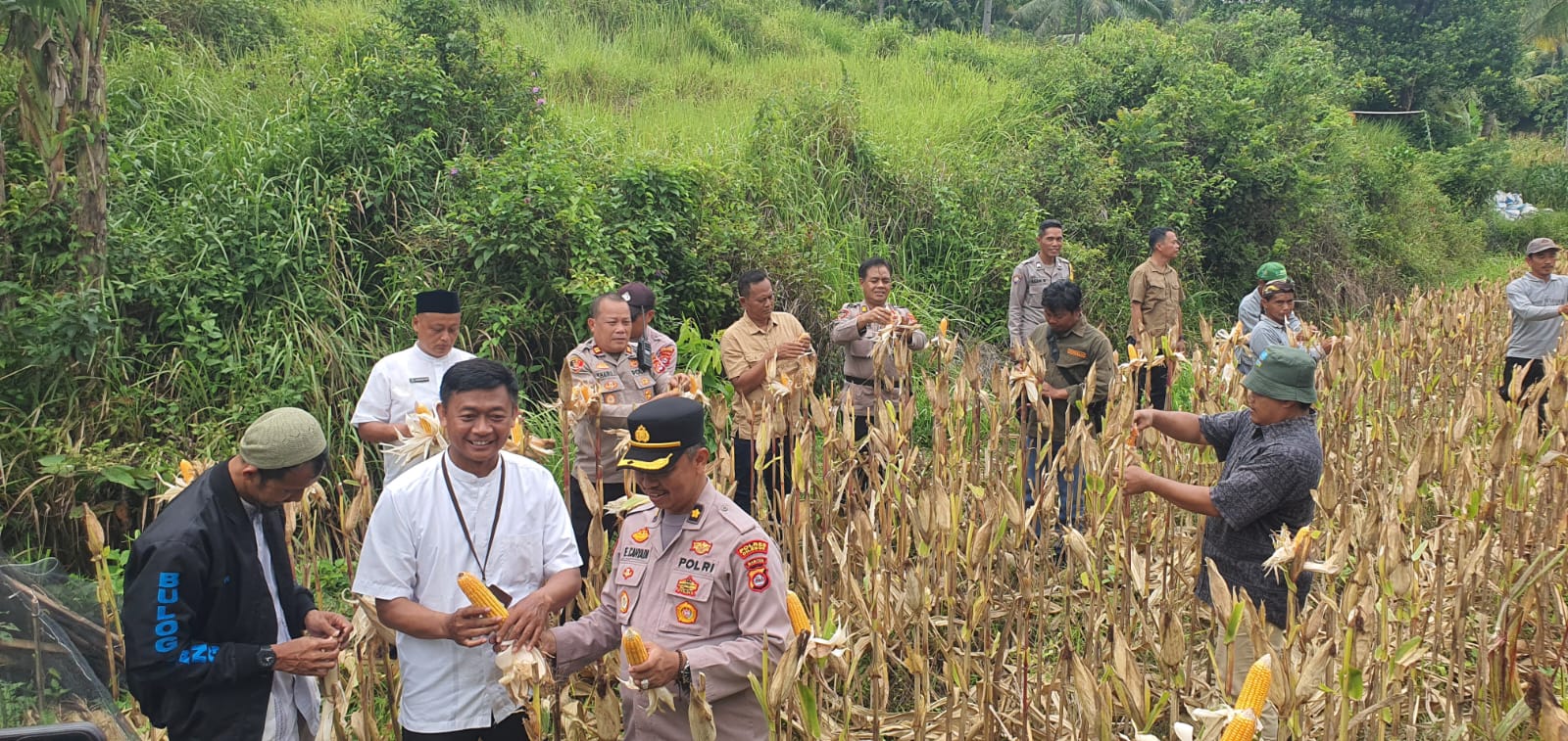 Kapolsek dan Bhabinkamtibmas Polsek Mancak Polres Cilegon Sambang dan Melaksanakan Kegiatan Panen Jagung serentak Kuartal III dalam rangka mendukung Swadaya Pangan tahun 2025.