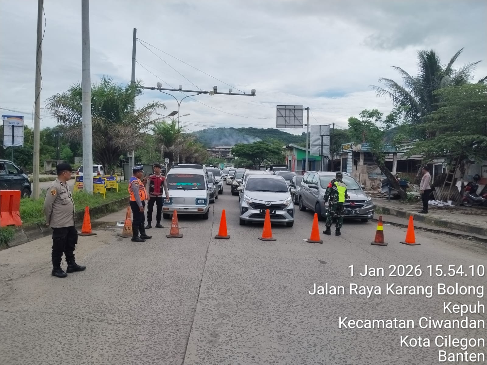 Cilegon - Guna Menciptakan kelancaran arus Mudik Natal tahun 2025 Dan Tahun Baru 2026 yang menuju Pelabuhan Pelindo Dan jalur wisata yang ada di daerah hukum Polsek Ciwandan Polres Cilegon Polda Banten,Pospam 5 Ciwandan berlakukan rekayasa Lalu lintas, Kamis (01/01/2026).