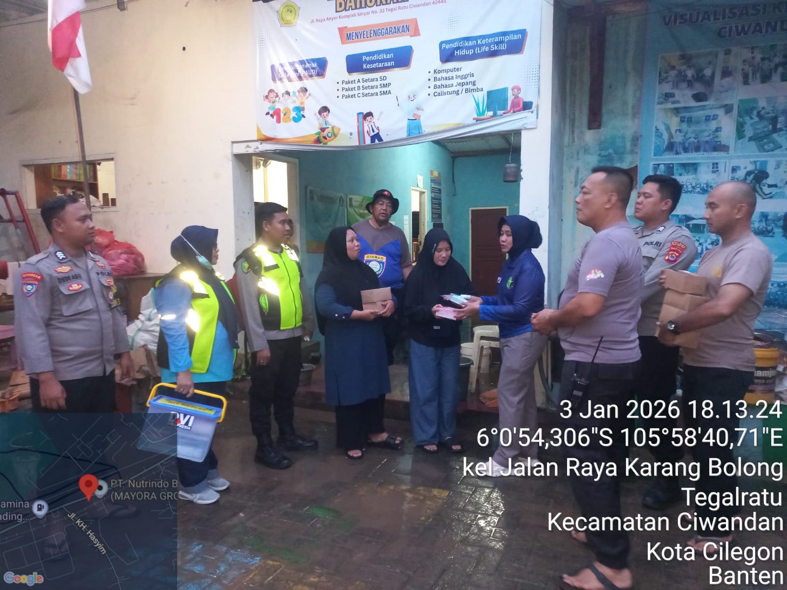 Kapolsek Ciwandan, Kasat Binmas, Kasi Dokkes, dan Anggota Baglog Logistik turut serta dalam aksi bantuan. Warga yang terdampak sebagian mengungsi di Musholla setempat.