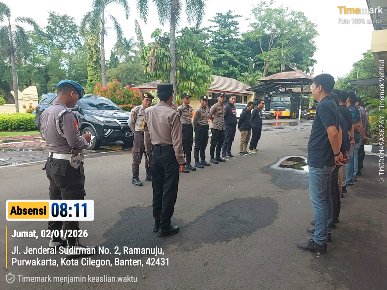 Cilegon, personel Satreskrim Polres Cilegon Polda Banten melaksanakan piket di penjagaan pintu masuk Polres Cilegon Polda Banten untuk memastikan mako Polres Cilegon dalam keadaan aman dan nyaman dalam melayani Masyarakat tanpa adanya gangguan kejahatan. Jumat (02/01/2026).