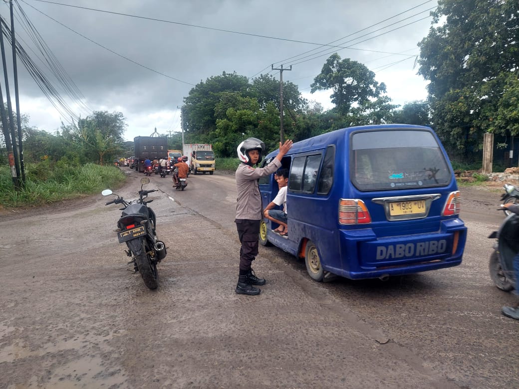 Demi Kelancaran Lalin, Bripka Bambang Personil Polsek Bojonegara Laksanakan atur Lalin Di Jalan Raya PT Bam Bojonegara