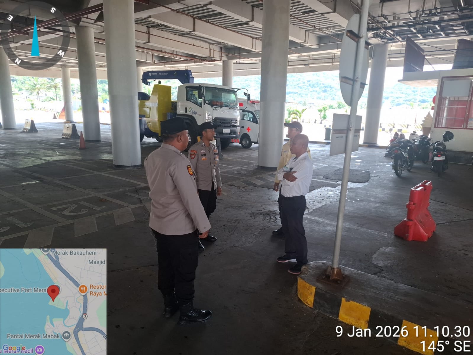\Cilegon - Personel Polsek Kskp Merak Polres Cilegon Polda Banten melaksanakan sambang dan patroli kawasan pelabuhan merak dalam rangka menjaga Harkamtibmas di Kawasan Pelabuhan Merak, Jumat (09/01/2026).