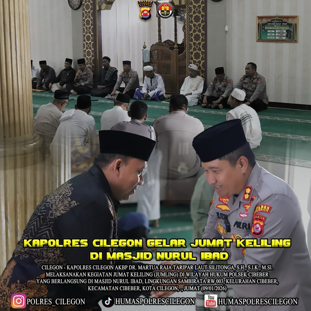 Polres Cilegon melaksanakan kegiatan Jumat Keliling di wilayah Cilegon. Sabtu (10/01/2026) Kegiatan ini bertujuan untuk meningkatkan kehadiran polisi di tengah masyarakat dan mempererat hubungan antara polisi dan warga.