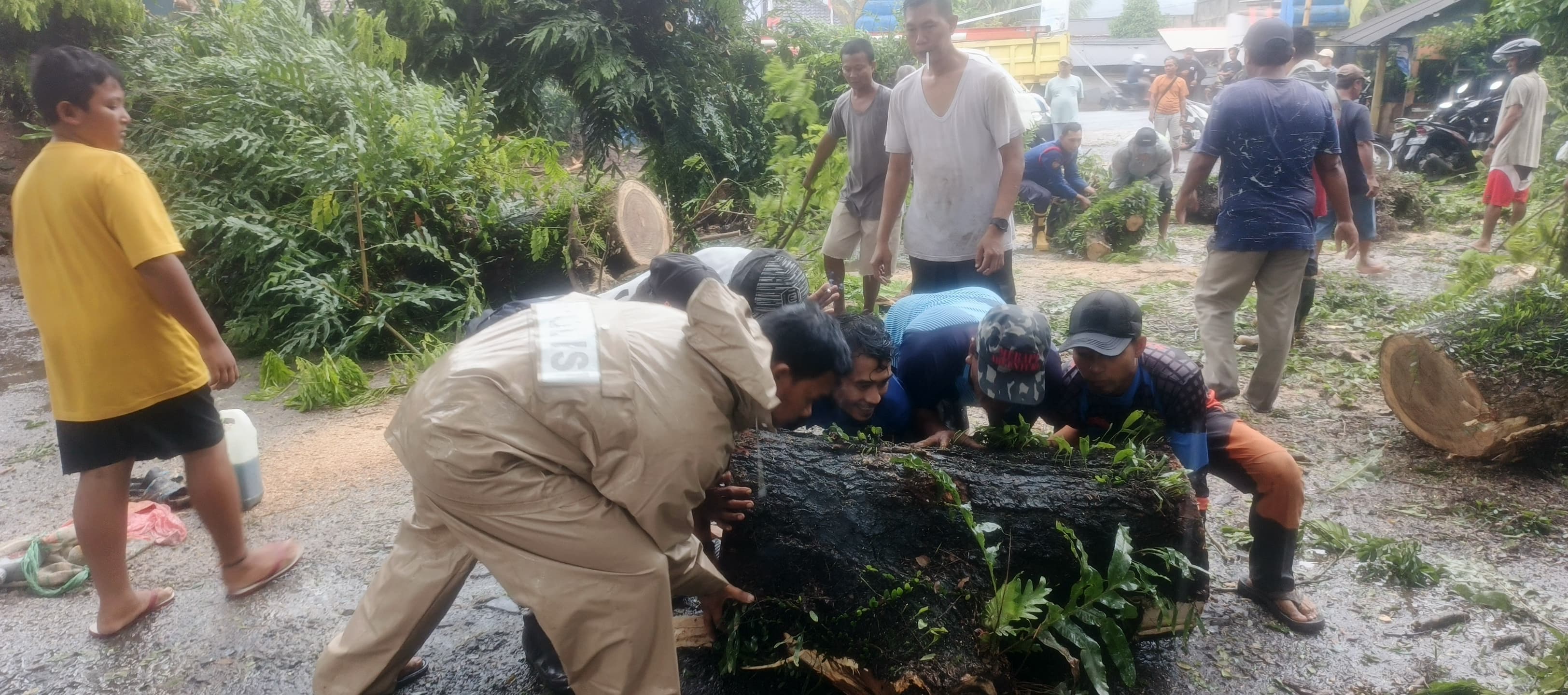 di samping Kp. Sirih Lor Ds. Bandulu Kec. Anyar Kab. Serang telah terjadi pohon tumbang yang diakibatkan hujan lebat dan angin kencang, Senin (12/01).