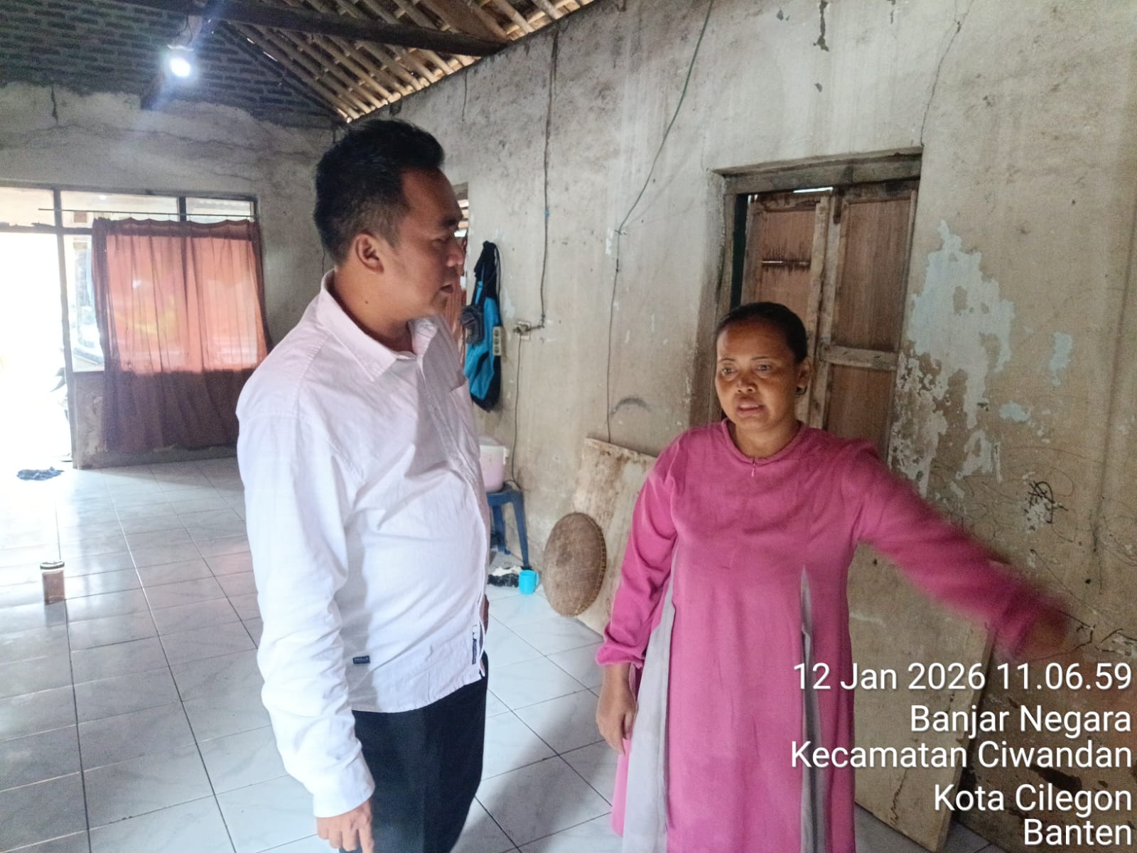 Cilegon - Personil Polsek Ciwandan Polres Ciegon Polda Banten Mengecek Dan Monitoring Sebuah rumah di Lingkungan Temugiring RT 002 RW 001 Kelurahan Banjarnegara Kecamatan Ciwandan Kota Cilegon Yang rubuh akibat hujan deras yang disertai angin pada Senin (12/01/2026).