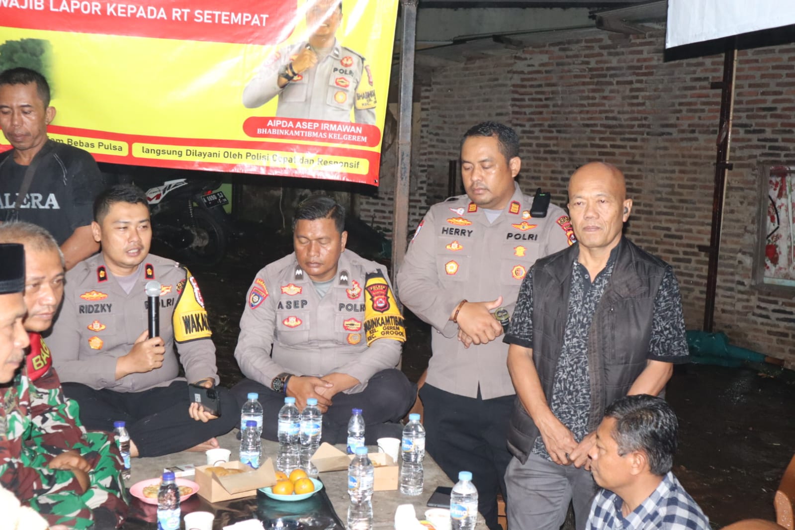 Kegiatan yang berlangsung mulai pukul 21.00 WIB tersebut dihadiri Wakapolres Cilegon KOMPOL M. Ridzky Salatun, S.I.K., didampingi Kasat Binmas Polres Cilegon IPTU Muhyidin, S.H., Kasi Propam Polres Cilegon AKP Heri Susanto, S.H., M.M., serta jajaran personel Polres dan Polsek. Turut hadir Plt Lurah Gerem Himatul Qismat, S.Pdi, unsur TNI, para Ketua RT/RW, serta perwakilan warga setempat.