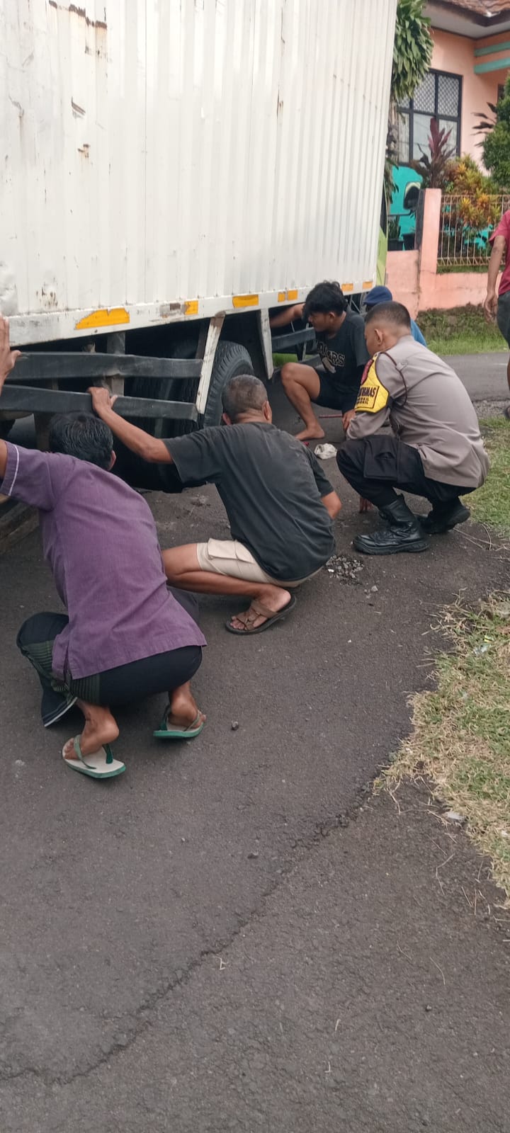 Cilegon - Bhabinkamtibmas Kelurahan Citangkil, AIPDA Warudin, bersama lurah dan linmas, melaksanakan evakuasi mobil box yang terperosok di tengah saluran air di Linkungan Citangkil, RT 03 RW 01, Kelurahan Citangkil, Kecamatan Citangkil, Kota Cilegon. Mobil box yang bermuatan air mineral tersebut berhasil dievakuasi menggunakan dongkrak dan balok kayu, Kamis (26/02/2026).