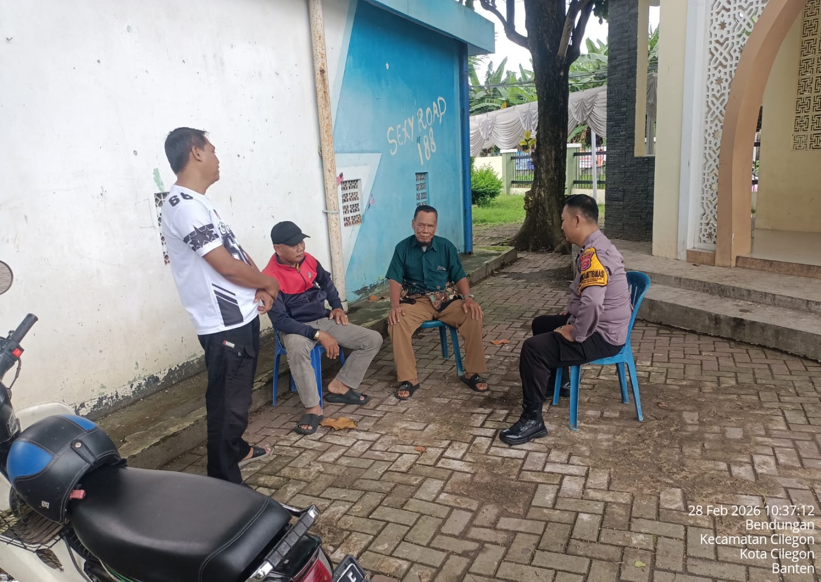 Bhabinkamtibmas Polsek Cilegon melaksanakan Sambang dan Komunikasi Kamtibmas dengan menyampaikan pesan Kamtibmas kepada masyarakat di Link. Kavling Blok J Kel. Bendungan Kec. Cilegon Kota Cilegon. Sabtu, 28/02/2026