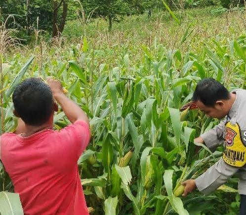 Dalam kegiatan monitoring ini, Bhabinkamtibmas meninjau langsung kondisi lahan jagung.
