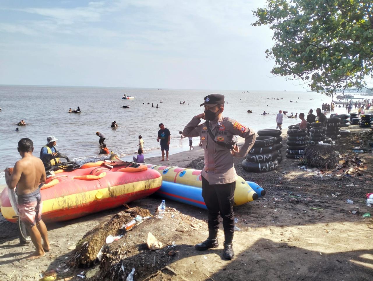 Personil Siwas Polres Cilegon Polda Banten Melaksanakan Giat Pengamanan Tempat obyek wisata di pantai Pasir Putih Anyer Kota Cilegon.