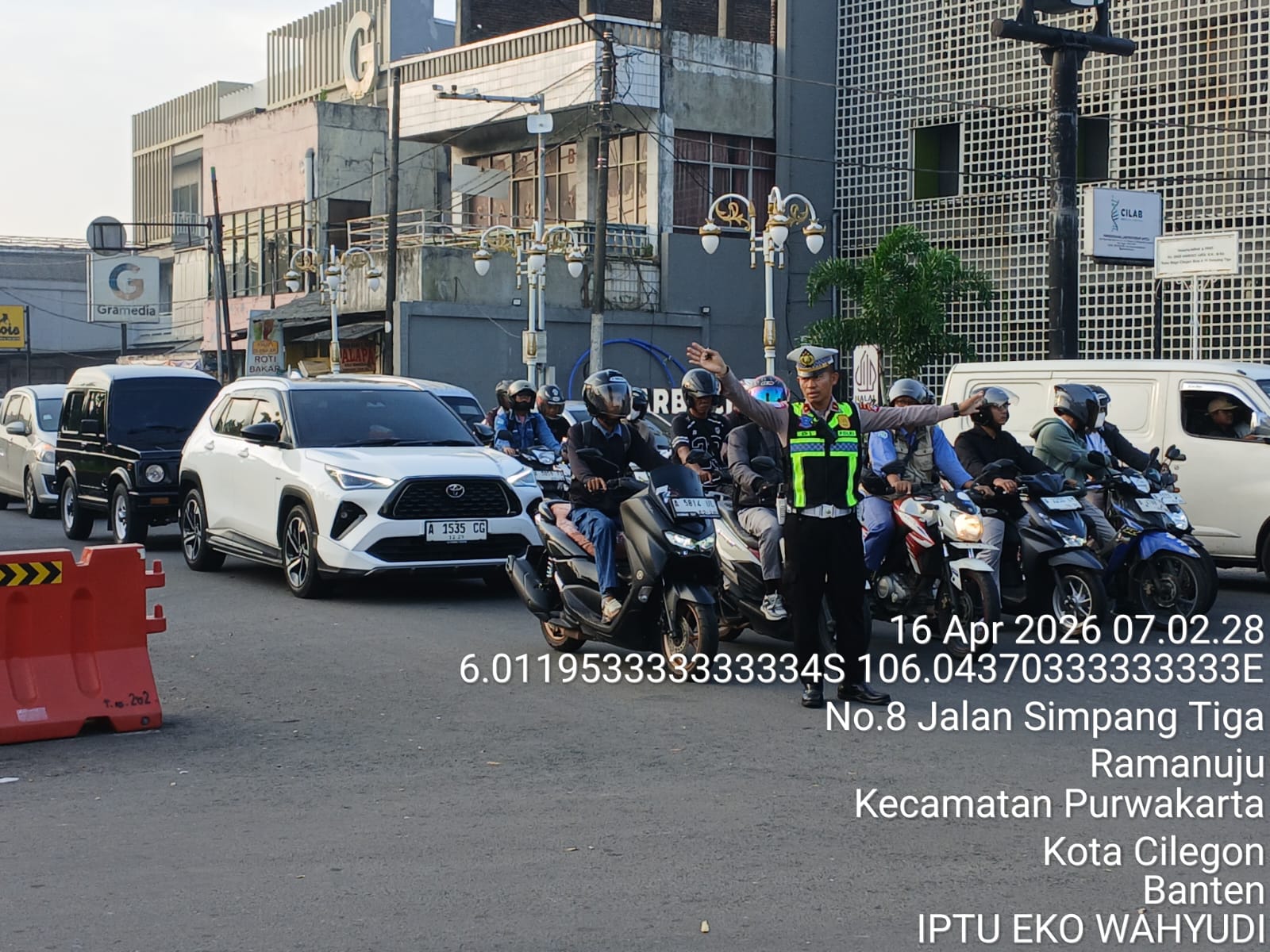 Cilegon, Satlantas Polres Cilegon Polda Banten – Berikan pelayanan kepada masyarakat Kasat lantas Polres Cilegon AKP Ridwan memerintahkan jajaran lalulintas untuk melaksanakan pengaturan lalu lintas di penggal – penggal jalan yang rawan kemacetan di Kota Cilegon, (Kamis,16/4/2026)